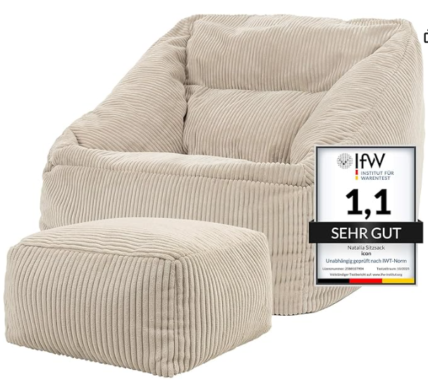 Der icon Riesensitzsack präsentiert sich als hochwertiges und alltagstaugliches Relaxmöbel. Verarbeitung, Materialwahl und Komfort bilden eine stimmige Einheit. Die flauschige Cordoberfläche sorgt für eine angenehme Haptik und verleiht dem Sitzsack eine wohnliche Ausstrahlung. Der mitgelieferte Hocker erweitert die Nutzungsmöglichkeiten sinnvoll. Besonders positiv fällt die robuste Innenkonstruktion mit separatem Füllbeutel auf. In puncto Bequemlichkeit überzeugt das Produkt durch gute Körperanpassung und stabile Rückenunterstützung. Auch bei längerem Gebrauch bleibt die Füllung formstabil und geruchsfrei. Die Reinigung ist dank abnehmbarem Bezug einfach möglich. Im Vergleich zu preislich ähnlichen Modellen schneidet der Sitzsack durchdachter ab. Die Verpackung ist funktional und sicher, wenn auch schlicht gehalten. Das Produkt zeigt keine sichtbaren Mängel oder Fertigungsfehler. Für Familien, Singles oder Studentenwohnungen ist das Möbelstück gleichermaßen geeignet. In kleineren Räumen sollte jedoch der Platzbedarf berücksichtigt werden. Der Stoff fühlt sich strapazierfähig an und verspricht eine lange Lebensdauer. Auch optisch fügt sich der Sitzsack harmonisch in verschiedene Einrichtungsstile ein. Die Gesamtleistung rechtfertigt den Preis. Im Test ergibt sich ein rundum positives Urteil mit nur geringfügigen Verbesserungspotenzialen. Das Produkt vermittelt Qualität, Stabilität und hohen Komfort.