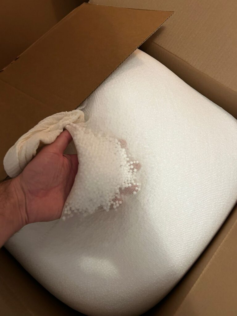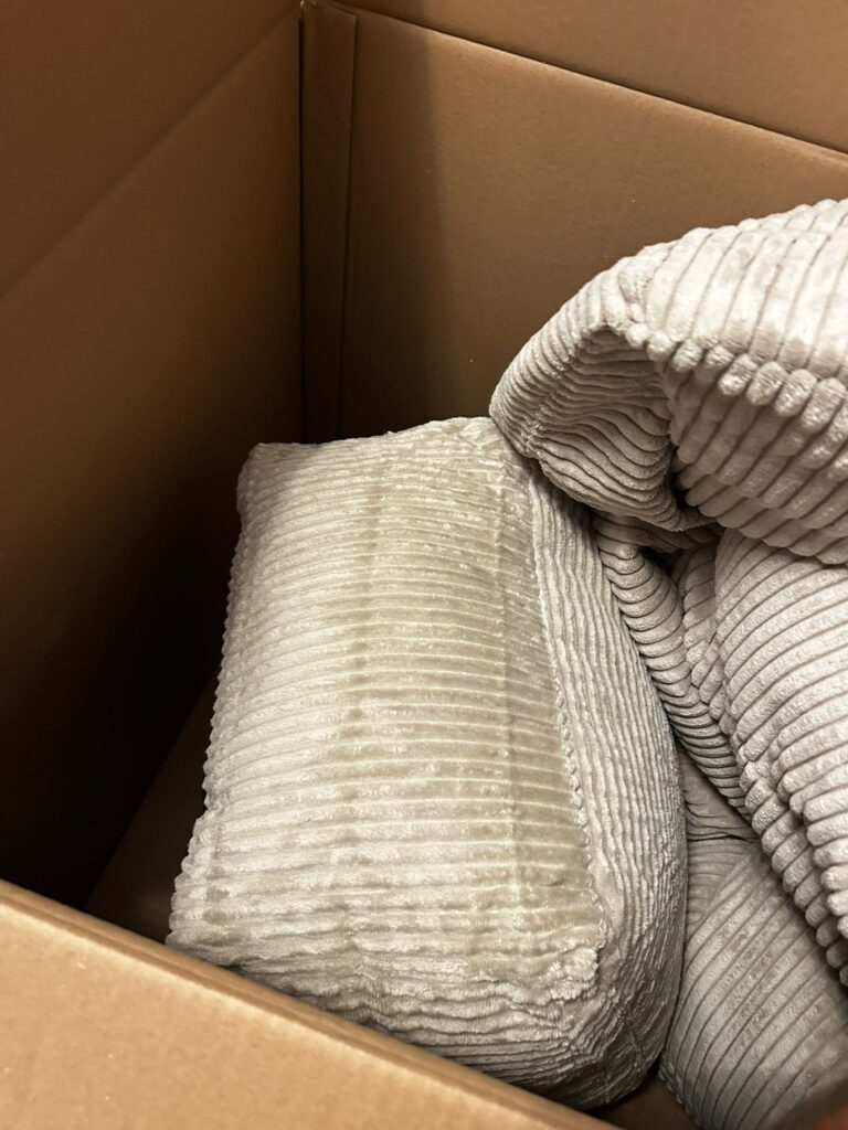 Herstellerinformationen und Verpackung Der Sitzsack stammt vom Hersteller icon, der sich auf Freizeit- und Loungemöbel spezialisiert hat. Das Produkt wird über verschiedene Vertriebspartner angeboten. Laut Hersteller wird der Sitzsack in Großbritannien entworfen und in der EU produziert. Der Versand erfolgt in einem großen Karton, der gut gesichert und doppelt verklebt ist. Die Verpackung trägt deutliche Warnhinweise, keine scharfen Gegenstände zum Öffnen zu verwenden, um den Innenbeutel nicht zu beschädigen. Im Inneren befinden sich mehrere Schichten Verpackungsmaterial, um die Füllung zu stabilisieren. Der äußere Cordbezug wird gefaltet geliefert, um Platz zu sparen, und kann nach dem Auspacken leicht entknittert werden. Die Verpackung macht insgesamt einen stabilen und durchdachten Eindruck. Die verwendete Kartonage ist stark genug, um das hohe Volumen der Füllung zu halten. Auf der Verpackung finden sich keine übermäßigen Werbeelemente oder Grafiken, was auf einen sachlich-funktionalen Versandprozess hinweist. Das Gesamtgewicht des Pakets ist beachtlich, was für die dichte Füllmenge spricht. Beim Öffnen des Kartons fällt auf, dass die Füllung vakuumfrei, also direkt in vollem Volumen geliefert wird. Dadurch ist kein nachträgliches Aufquellen nötig. Insgesamt zeigt sich eine saubere, zweckmäßige Verpackung ohne unnötigen Kunststoffverbrauch.