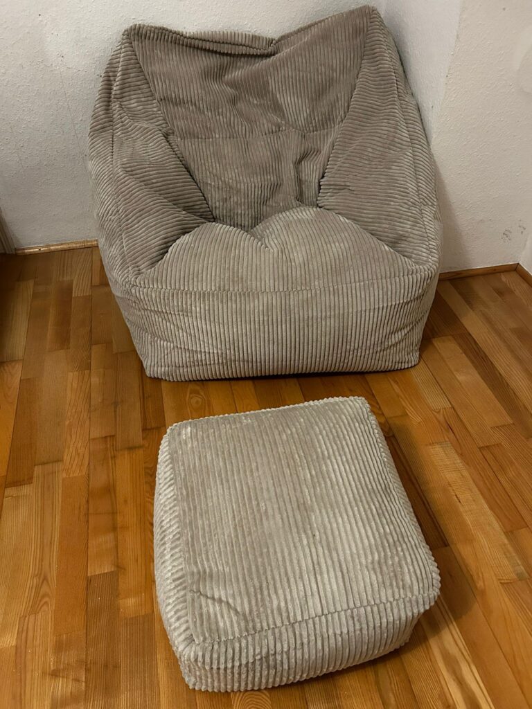 Der Sitzsack besteht aus einer dicken Cordoberfläche mit breiter Rippenstruktur, die haptisch sehr angenehm wirkt. Das Material fühlt sich warm und weich an, bietet jedoch auch eine gewisse Festigkeit gegen Durchscheuern. Innen befindet sich eine Füllung aus weißen EPS-Perlen, die für Formstabilität und Druckausgleich sorgen. Die Füllung befindet sich in einem separaten Innenbeutel, der durch einen Reißverschluss verschlossen ist. Der Bezug ist abnehmbar und über einen robusten Doppelreißverschluss erreichbar. Die Verarbeitung der Nähte ist gleichmäßig und stabil, wodurch keine Kügelchen austreten. Der Stoff hat eine mittlere bis schwere Qualität und ist farblich gleichmäßig gewebt. Die Rückseite ist leicht strukturiert und rutschfest, sodass der Sitzsack beim Sitzen nicht wandert. Der beigefügte Hocker ist aus demselben Material gefertigt und farblich perfekt abgestimmt. Der Bezug ist laut Hersteller pflegeleicht, sollte aber vorzugsweise per Handwäsche oder Schonwaschgang gereinigt werden. Die EPS-Füllung kann bei Bedarf nachgefüllt oder ausgetauscht werden. Der Sitzsack formt sich beim Sitzen ergonomisch um den Körper und bietet so eine gleichmäßige Druckverteilung. Das Material wirkt langlebig, wenngleich Cord naturgemäß etwas Staub und Fusseln anzieht. Die Reißverschlüsse laufen leichtgängig, sind aber ausreichend verdeckt, um keine Druckstellen zu verursachen. Der innere Beutel besteht aus atmungsaktivem Polypropylen-Gewebe, das die Kügelchen sicher einschließt. Der Sitzsack riecht nach dem Auspacken neutral und zeigt keine chemischen Dämpfe. Insgesamt ergibt sich ein harmonischer Materialeindruck mit durchdachter Funktionalität und hochwertigem Textilgriff.