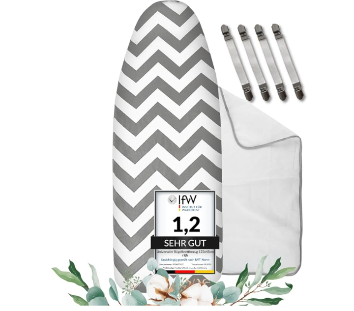 Der Bezug besteht aus einer Kombination von Baumwolle und Polsterung. Die Baumwolloberfläche ist in einem grau-weißen Zickzack-Muster gestaltet. Dieses Design wirkt modern und passt in viele Haushalte. Die Polsterung ist mehrschichtig aufgebaut, um ein gleichmäßiges Bügelergebnis zu erzielen. Der Stoff fühlt sich robust und gleichzeitig weich an. Durch den mehrlagigen Aufbau wird die Hitze des Bügeleisens gleichmäßig reflektiert. Dadurch glätten sich Textilien schneller und effizienter. Im Lieferumfang enthalten sind mehrere Spannclips aus Metall. Diese Clips halten den Bezug sicher am Brett fest. Der Bezug verfügt über einen elastischen Gummizug, der umlaufend eingearbeitet ist. Dadurch lässt er sich leicht überziehen und festziehen. Das Material ist hitzebeständig und für Dampfbügeleisen geeignet. Der Stoff ist dampfdurchlässig und verhindert Feuchtigkeitsstau. Gleichzeitig sorgt die Polsterung für Komfort beim Bügeln. Die Verarbeitung wirkt hochwertig und langlebig. Nähte und Kanten sind sauber verarbeitet. Der Bezug ist für verschiedene Brettgrößen geeignet. Das Zickzack-Muster sorgt für eine optische Aufwertung des Bügelbretts. Insgesamt vermittelt das Material einen soliden und alltagstauglichen Eindruck.